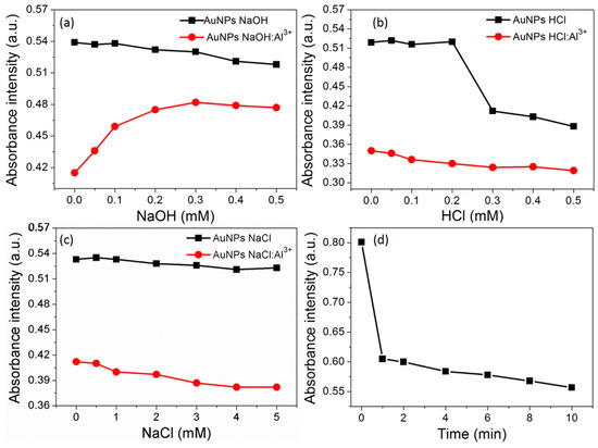 The ionic strength is also an important parameter for the detection of the target analyte. The effect of the ionic strength of AuNPs stability is presented in Figure 5c, with increasing molar ratios of the NaCl. The absorbance intensity at 530 nm was not changed after the addition of NaCl solution, indicating the stability of AuNPs at different ionic strength. However, the addition of the Al3+ to AuNPs solution with increasing concentration of NaCl solution showed an enhanced analytical response at higher ionic strength.