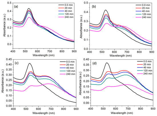 The time course of the spectral response of AuNPs at room temperature; (a) in the presence of the Al3+ (10 ppb); (b) in the presence of the Al3+ (20 ppb), (c) in the presence of the Al3+ (30 ppb); (d) in the presence of the Al3+ (40 ppb).