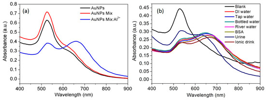 (a) The spectral response of AuNPs towards the Al3+ in presence of mixture of multiple kinds of metal ions at room temperature; (b) The spectral response of AuNPs towards the Al3+ in real samples at room temperature.