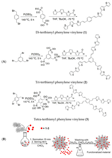 Synthetic route of CNH samples having adsorbed terthienyl dyes: (A) Synthesis of dyes (1)–(3) that will form non-covalent aggregates with CNHs; (B) pictorial illustration of the process used to attach the dyes to CNHs.