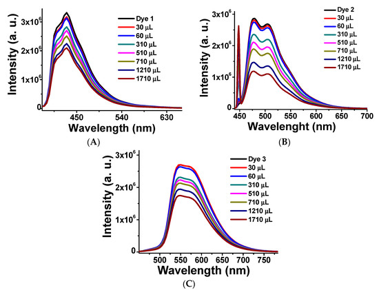 Fluorescence spectra of dyes 1 (A) (λex = 363 nm); 2 (B) (λex = 409 nm), and 3 (C) (λex = 442 nm) upon addition of increasing amounts of CNHs (0.01 mg/mL). The solvent of these measurements was DMF and the concentration of the organic compound constant during the experiment.