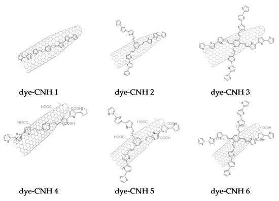 This noncovalent interaction between terthienyl dyes and CNHs allows the preparation of materials containing both components. Figure 7 contains the list of materials that have been tested as additives in the preparation of titania DSSC devices.