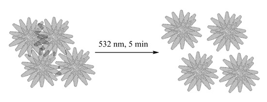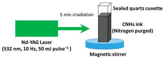 CNHs powder samples were stirred magnetically and ultrasonicated for 5 min in o-dichlorobenzene (5 mg/mL) in a quartz cuvette and exposed to the pulses from the second harmonic of a Nd:YAG laser (50 mJ·pulse−1) for 5 min (see Scheme 1).