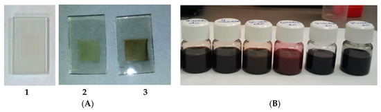 (A) 1. TiO2 Film; 2. TiO2 film sensitized using dye-CNH solution not irradiated and 3. TiO2 sensitized using laser irradiated dye-CNH solution and (B) Photograph of o-DCB suspension of dye-CNHs 1–6 (from left to right).