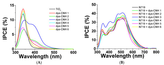 Photoresponse spectra plotted as incident photon-to-current efficiency (IPCE). (A) Without N719 dye sensitizer and after sensitization with N719 dye (B).