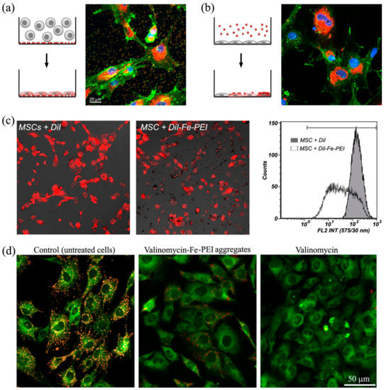 Next, the capacity of Fe-PEI NPs to incorporate DiI by aggregation and subsequently release it into the cells they interact with was studied by using valinomycin, a lipid-soluble potassium ionophore able to induce mitochondrial membrane permeabilization and electrochemical potential dissipation. Valinomycin is known as a cargo that easily interacts and internalizes into cells. The effectiveness of valinomycin entrapped into Fe-PEI aggregates was assessed by evaluation of the mitochondrial membrane potential (ΔΨm) in MSCs after cell interaction with valinomycin-Fe-PEI aggregates using JC-1 [26]. As revealed in Figure 3d, ΔΨm was almost completely lost after 24-h exposure of MSCs to valinomycin-Fe-PEI aggregates, to a similar extent to MSCs exposed to the same dose of valinomycin given as such.