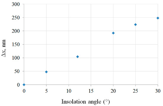 Lateral shift of the maximum intensity of the nanojet inside the TiO2 film versus exposure angle.