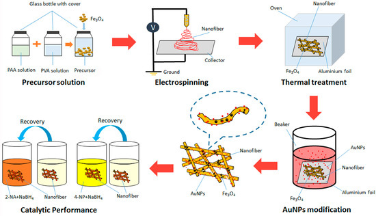 The evaluation of catalytic performance of PVA/PAA/Fe3O4@AuNPs electrospun membrane was executed by catalytic reduction of aqueous 4-NP and 2-NA solution [54]. NaBH4 was used as a reducing agent for this catalytic reduction reaction, and all the progress was under the monitoring by UV-VIS spectroscopy at room temperature (Figure 1). The PVA/PAA/Fe3O4@AuNPs electrospun membrane (10 mg) was added in an aqueous 4-NP solution (10 mL, 0.005 M), followed by adding fresh aqueous NaBH4 solution (20 mL, 0.1 M) rapidly. The absorbance was monitored every 3 min by UV-VIS spectroscopy until the solution became colorless. After that, the sample was removed by external magnetic field and washed with ethanol and ultra-pure water for several times. The catalysis of aqueous 2-NA solution (10 mL, 0.005 M) was also applied to evaluate the catalytic capacity of PVA/PAA/Fe3O4@AuNPs electrospun membrane. In order to further characterize the recycling capacity, the sample catalyzed new aqueous 4-NP and NaBH4 mixture solutions 10 times.