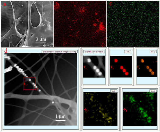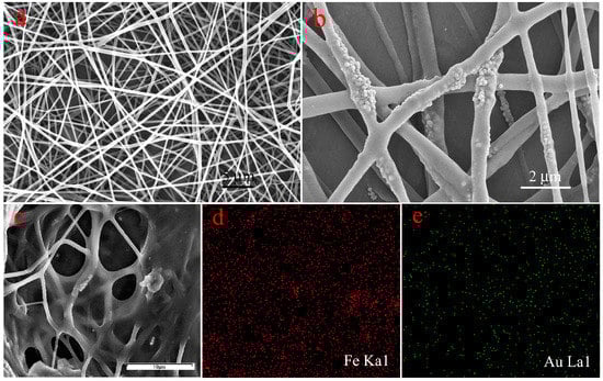 SEM images of the prepared PVA/PAA nanofiber (a), PVA/PAA/Fe3O4 nanofiber (b), PVA/PAA/Fe3O4@AuNPs nanofibers with coated carbon (c), and Fe/Au elemental mapping (d,e).