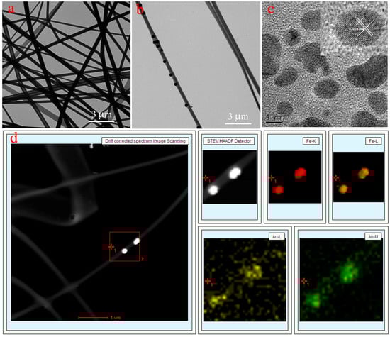 TEM images of the prepared PVA/PAA nanofibers (a), PVA/PAA/Fe3O4 nanofiber (b), high resolution of AuNPs (c), and PVA/PAA/Fe3O4@AuNPs nanofibers with Fe/Au elemental mapping (d).