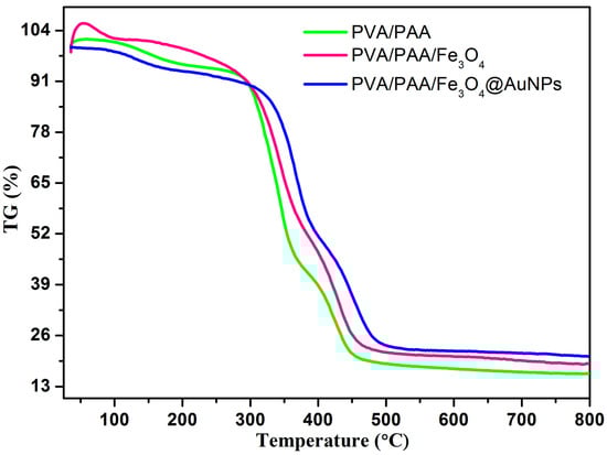 TG curves of PVA/PAA, PVA/PAA/Fe3O4, and PVA/PAA/Fe3O4@AuNPs nanocomposites.