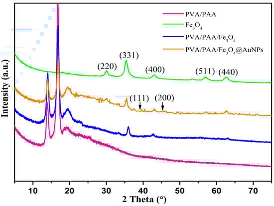 XRD data was also measured to further identify the structure of the membrane, as shown in Figure 5. According to the obtained results, the characteristic absorption peaks of 2θ at 30.0°, 35.3°, 43.0°, 57.0°, and 62.7° can be assigned to the (220), (311), (400), (511), and (400) planes of the face-centered cubic Fe3O4 phase. In addition, the PVA/PAA/Fe3O4 and PVA/PAA/Fe3O4@AuNPs nanocomposites both have the same characteristic peaks, which indicates the introduction of Fe3O4 nanoparticles in the nanocomposites. The XRD pattern of the PVA/PAA/Fe3O4@AuNPs nanocomposite, compared to the XRD patterns of the PVA/PAA nanofibers and PVA/PAA/Fe3O4 nanocomposites, indicates newly emerging diffraction peaks with 2θ values of 38.9° and 46.1°, which are indexed to the (111) and (200) cubic lattice planes of gold nanoparticles. Similar results about diffraction peaks of AuNPs have been reported in previous reports [54,65]. The signals in the XRD measurements of PVA/PAA/Fe3O4@AuNPs nanocomposites are slightly weak mainly due to the thin film state of the nanocomposites containing fewer AuNPs and Fe3O4 particles in the measurement process.