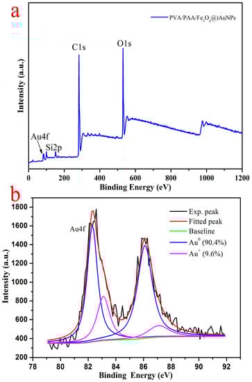 In order to verify the XRD spectra and TG results, the composition analysis of the as-prepared PVA/PAA/Fe3O4@AuNPs nanocomposite membrane was performed via X-ray photoelectron spectroscopy (XPS), as shown in Figure 6. The survey data demonstrate the characteristic peaks such as C1s, O1s and Au4f in Figure 6a. The Si2p peak came from the Si plate as a substrate [58,66]. In addition, there is a pair of typical spin splitting peaks of Au4f in the spectra with binding energies of 82.5 and 86.3 eV, and the distance between the two characteristic peaks is 3.8 eV, which can be assigned to the 4f5/2 and 4f7/2 lines of metallic gold. This is slightly different from the results of a previous study [67] because, in comparison with the main Au0 species (accounting for 90.4%), there are only 9.6% Au+ species resulting from residual HAuCl4 molecules that are not completely restored in situ to Au nanoparticles. The peaks located at around 83.5 and 87.0 eV correspond to the spin orbit splitting components of Au4f. Combined with the above characterization, these results represent the Au0 species that have been successfully incorporated on nanofibers.
