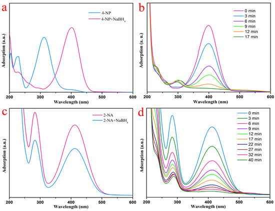 Catalytic reduction of (a) 4-NP before and after adding NaBH4 aqueous solution; (b) reduction of 4-NP with PVA/PAA/Fe3O4@AuNPs composite; (c) 2-NA before and after adding NaBH4 aqueous solution; (d) reduction of 2-NA with PVA/PAA/Fe3O4@AuNPs composite.