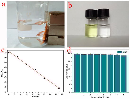 Magnetic recovery of PVA/PAA/Fe3O4@AuNPs nanocomposites with external magnetic field (a); comparison of 4-NP solution before and after catalytic reaction (b); the relationship between ln(Ct/C0) and the reaction time (t) of the nanocomposite catalyst (c); the reusability test of PVA/PAA/Fe3O4@AuNPs nanocomposites as catalysts for the reduction of 4-NP (d).