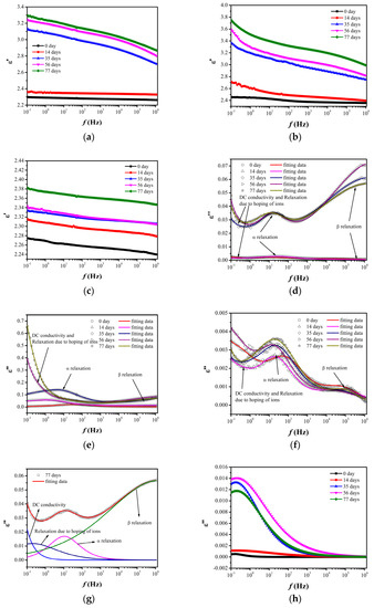 The fitting results of neat LDPE with the aging time of 77 days and the relaxations due to hopping of ions are shown in Figure 6 and the DC conductivity of materials is shown in Table 1. It can be seen that with the increasing aging time, DC conductivity and the relaxations due to hopping of ions of neat LDPE and LDPE/SiO2 nanocomposites increase dramatically, especially with the appearance of thermooxidative reactions in materials. However, LDPE/MgO nanocomposites show much smaller DC conductivity and relaxation due to hopping of ions than the other two materials and these properties change slightly during the whole aging process, exhibiting the ability to protect DC conductivity and permittivity.