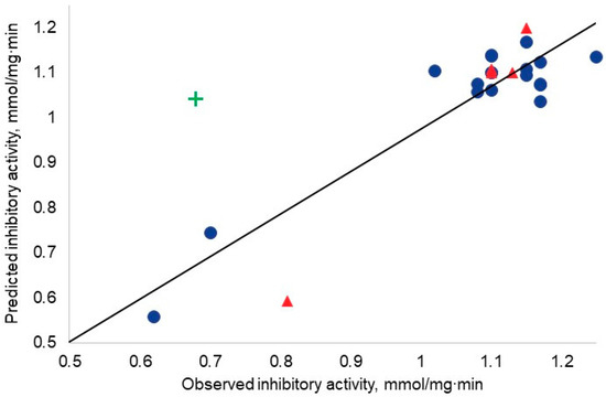 Observed–predicted diagram. Blue dots represent the training set; red triangles represent the test set; green cross represent the outlier.
