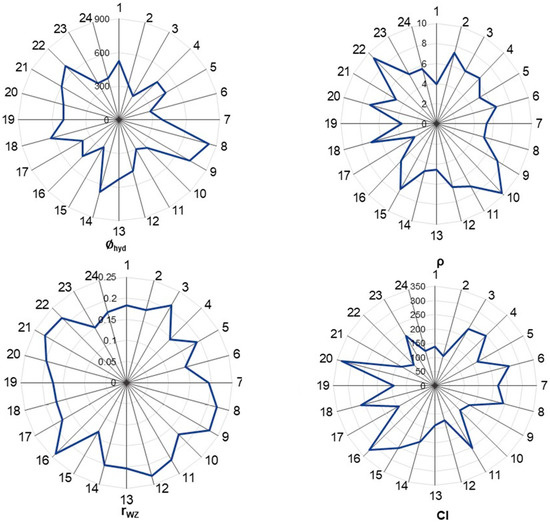 The developed model contains four descriptors: the hydrodynamic size (∅hyd), density (ρ), the Wigner–Seitz radius (rwz), and the covalent index (CI). In Figure 2, the distributions of values for the descriptors are represented using diagrams. QSAR methodology assumes that the structural variation causes the variation of physical or biological properties; therefore, adequate distribution of properties (descriptors) within the training/test set is crucial. As one can see from Figure 2, the distributions of selected descriptors varied considerably.