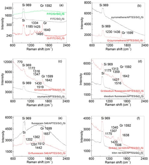 Raman-FL spectra of fluorescein isothiocyanate (FITC) (a), pyrromethene (b), coumarin (c), disodium fluorescein (d), fluorescein 548 (e), and kiton red 620 (f) covered with (red) or without graphene (black). The substrates are SiO2/Si in (a) and APTES/SiO2/Si in (b–f). APTES: aminopropyltriethoxysilane. For the green curve in (a), the SiO2/Si substrate was first covered with a single layer graphene forming a Gr/SiO2/Si structure (Gr: graphene), then the FITC dyes were adsorbed above graphene. The Raman integration time was 30 s (red and green spectra in (a)), 10 min (black spectrum in (a)), or 20 min (for (b–f)). The peaks at 969 cm−1 and ca. 1590–1599 cm−1 were from Si and graphene, respectively.