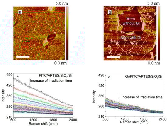 Typical (top) atomic force microscopy (AFM) images and (bottom) Raman-fluorescence spectra of FITC in the absence/presence of graphene (Gr): (a) FITC/APTES/SiO2/Si, washed in acetone for 27 h; (b) Gr/FITC/APTES/SiO2/Si, washed in acetone for 12 h. The time evolution of the fluorescence spectra (c,d) is used to quantify the photo-bleaching kinetics of the dye. The spectrum was integrated for 5 s, with continuous laser exposure and 5 s delay between spectrum acquisitions. Scale bars in the AFM images represent 500 nm in (a) and 1 μm in (b).