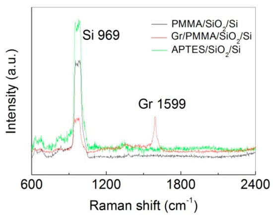 Raman spectra of poly-methylmethacrylate (PMMA) (black), graphene (red), and APTES (green), respectively. PMMA was spin-coated on SiO2/Si substrate (PMMA/SiO2/Si). Graphene (Gr) with PMMA was transferred onto the SiO2/Si substrate (Gr/PMMA/SiO2/Si). APTES was covalently attached onto the SiO2/Si substrate (APTES/SiO2/Si). The Raman integration time is ca. 2~5 min. PMMA, graphene, and APTES showed no fluorescence. Note that compared to Figure 2, the Raman peaks of Si and graphene are visible in this case due to the absence of fluorescence background and hence much reduced shot noise. The Raman peaks of PMMA and APTES were not observed due to their low Raman cross section.