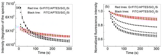 The photo-bleaching curve of FITC dye contacted with graphene (red) and without graphene (black). The intensity was calculated by integration from 583 to 2411 cm−1 (a) and normalized by the maximum value (b). Each curve represents a separate kinetic measurement on a different location of the same sample. Each spectrum was integrated for 5 s and measured every 10 s over a period of 5 min.