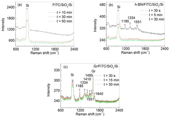 Previous studies in this area of research suggest that graphene protects the dye from photo-bleaching by isolating it from air []. To test this hypothesis, we compared the photo-stability of FITC dye in the presence and in absence of graphene or h-BN under continuous laser exposure. The Raman data in Figure 5 clearly shows that graphene prevents the dye from photo-bleaching. For FITC dye adsorbed on SiO2/Si without graphene (Figure 5a), strong fluorescence background is observed at the beginning of the experiment, which buried the Raman signals. The fluorescence signal completelyα pre-exponential factor, k photo-bleaching rate, and average photo-bleaching rate disappeared after 30 min of continuous laser illumination. For FITC dye sandwiched between h-BN and SiO2/Si (Figure 5b), both fluorescence background and Raman signal are clearly observed at the beginning of the experiment. However, both the Raman peaks and the fluorescence disappeared 5 min later. Here, the observed Raman peaks are attributed to the h-BN-induced Raman enhancement []. In contrast, for FITC sandwiched between graphene and SiO2/Si (Figure 5c), the Raman peaks are clearly observed. The very different behavior between h-BN and graphene shows that merely having a gas barrier film (e.g., h-BN) is not sufficient to protect the dye from photo-bleaching []. It is also worth noting that in this experiment we did not modify the SiO2 substrate with APTES, which should reduce the surface coverage of FTIC dye compared to the experiment shown in Figure 2 and Figure 4. In this case, we observed lower FL background (e.g., compare Figure 5c with Figure 2D) and slower bleaching kinetics (e.g., compare Figure 5c with Figure 4b), which we attribute to a better physical contact between the dye and graphene at lower surface coverage.