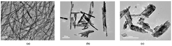 The structural characterizations of the VO2 nanoparticles were done by transmission electron microscopy (TEM) and X-ray powder Diffraction (XRD). TEM images indicate the VO2 nanoparticles of different morphology, fibers, rods, and sheets (Figure 1). The formation of VO2 nanoparticles is confirmed from the X-ray diffraction pattern (Figure 2). The VO2 nanoparticles with fiber, sheet, and rod shapes have the same crystal structures as those reported in the literature [34,35], and are monoclinic VO2 (Joint Committee on Powder Diffraction Standards card No. 31-1438 and No. 65-7960: see Figure 2).