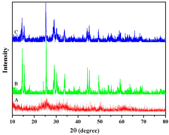 XRD patterns of VO2 nanoparticles. (A) VO2 nanofiber; (B) VO2 nanosheets; (C) VO2 nanorods.