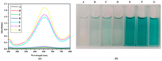 UV-Visible absorption spectra (a) and color changes (b) of different reaction systems. ((A) TMB + H2O2, (B) TMB + VO2 nanorod, (C) TMB + VO2 nanosheet, (D) TMB + VO2 nanofiber, (E) TMB + VO2 nanorod + H2O2, (F) TMB + VO2 nanosheet + H2O2, (G) TMB + VO2 nanofiber + H2O2).