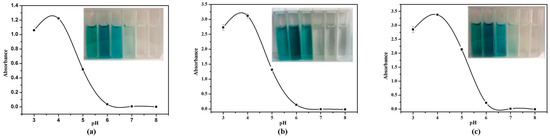 The effect of pH on absorption value with TMB and color changes. (a) VO2 nanofibers; (b) VO2 nanosheets; (c) VO2 nanorods. The error bars represent the standard deviation of three measurements.