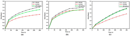 To investigate the influence of different reaction buffers on the VO2 nanoparticles characteristics, catalytic reactions incubated in difference buffer solution—including citrate, phosphate, and acetate—were examined, under conditions identical to these used in above. For a blank, only substrate solution was used. All experiments were conducted at room temperature (25 °C).