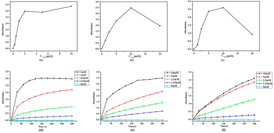 The effect of VO2 nanofibers (a,d); VO2 nanosheets (b,e); and VO2 nanorods (c,f) concentrations on absorption value with TMB in pH 4.0 citrate buffer solution. The error bars represent the standard deviation of three measurements.