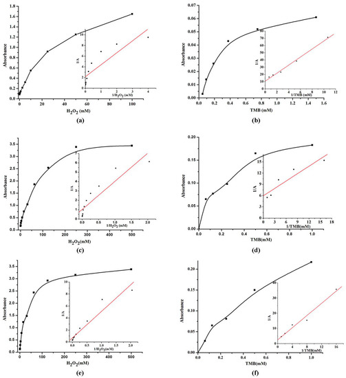 For further understanding the influence of particle morphology on the catalytic mechanism of VO2 nanoparticles, the steady-state kinetic assay for VO2 nanoparticles were determined in detail. As shown in Figure 7, the typical Michaelis-Menten curve were obtained for VO2 nanozymes. Michaelis-Menten constant (KM) and maximum initial velocity (Vmax) were known from Michaelis-Menten curve use a Lineweaver-Burk plot. A comparison of the kinetic parameters of VO2 nanozymes, V2O5 nanozymes, Fe3O4 magnetic nanoparticle (MNPS), and HRP was given in Table 1. The KM of VO2 nanofibers, nanosheets, and nanorods with TMB were 0.518, 0.111, and 0.801 mM, respectively. The Vmax of VO2 nanofibers, nanosheets, and nanorods with TMB were 9.3 × 10−5, 1.68 × 10−4, and 3.99 × 10−4 M·s−1, respectively. The KM of VO2 nanofibers, nanosheets, and nanorods with H2O2 were 1.043, 2.924, and 6.469 mM. The Vmax of VO2 nanofibers, nanosheets, and nanorods with H2O2 were 4.66 × 10−4, 9.73 × 10−4, and 1.46 × 10−3 M·s−1, respectively. The KM values shows that VO2 nanosheets with TMB as the substrate was apparently lower than VO2 nanofibers, VO2 nanorods, V2O5 nanozymes, Fe3O4 MNPS, and HRP. It shows that the VO2 nanosheets have a higher affinity to TMB compared with VO2 nanofibers, VO2 nanorods, Fe3O4 MNPS, and HRP. Which means that a lower TMB concentration was required to reach the maximal activity for VO2 nanosheets. The apparent KM values of VO2 nanofibers with H2O2 as the substrate was apparently lower than VO2 nanorods, VO2 nanosheets, Fe3O4 MNPS, and HRP. It shows that the VO2 nanofibers have a higher affinity for H2O2 compared with VO2 nanosheets, VO2 nanorods, Fe3O4 MNPS, and HRP. That means a lower H2O2 concentration was required to reach the maximal activity for VO2 nanofibers.