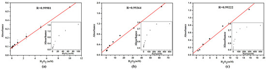 A dose-response curve depending of the absorbance at 656 nm in the presence of different concentrations of H2O2. (a) VO2 nanofibers; (b) VO2 nanosheets; (c) VO2 nanorods. Error bars represent the standard deviation of three measurements. Conditions: pH, 4.0 (0.2 M citrate buffer); temperature, 25 °C; incubation time, 5 min.