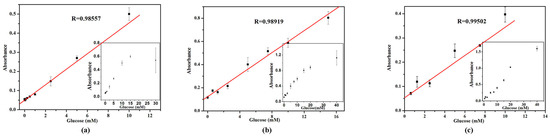 A dose-response curve depending of the absorbance at 656 nm in the presence of different concentrations of glucose. (a) VO2 nanofibers; (b) VO2 nanosheets; (c) VO2 nanorods, in which error bars represent the standard deviation of three measurements. Conditions: pH, 4.0 (0.2 M citrate buffer); temperature, 25 °C; incubation time, 5 min.