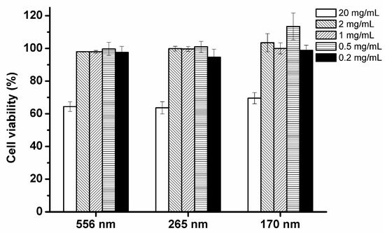 The inhalation of nanoparticles has raised the possibility of toxicity even for nutraceutical nanocarriers formulated with food grade ingredients [17,22]. The potential cytotoxicity of the emulsions and droplet size effects were evaluated in a Caco-2 cell model with cell viability determined by MTT assay at varying dilutions (Figure 3). The results indicated that the viability of cells was dependent on the concentration of emulsions. For un-diluted emulsions (initial sodium caseinate concentration, C0 = 2% = 20 mg/mL, corn oil = 10% = 100 mg/mL) the cell viabilities relative to control were 64%, 64%, and 69% for 556, 265, and 170 nm, respectively. The results indicated that the 10% lipid-based emulsions are toxic without dilution and there were no noticeable size effects on cytotoxicity. After 1:10 dilution (2 mg/mL protein concentration and 10 mg/mL oil concentration), cell viabilities relative to DMEM control, were 98%, 100%, and 103% for 556, 265, and 170 nm, respectively, suggesting that the lipid-based emulsions showed no toxicity. All the cell survival rates were above 95% when treated with emulsions of 2 mg sodium caseinate/mL or less. The results indicate that the cytotoxicity of lipid-based emulsions are concentration-dependent. Lipid-based emulsions of 2 mg sodium caseinate/mL were used for further study of the cellular uptake mechanism.