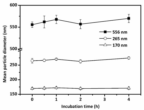 Stability of three different mean droplet size emulsions (556, 265, and 170 nm, respectively) during 4 h incubation in PBS (pH 7.4) at 37 °C. Stability was evaluated by the mean droplet diameter changes of emulsions measured at several incubation intervals (0, 0.5, 1, 2, and 4 h).