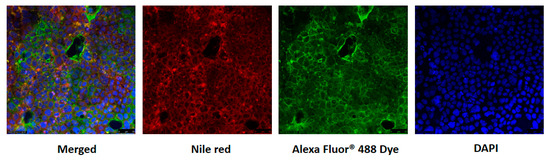 Endocytosis has been defined as the process by which nanoparticles or macromolecules are transported into cells by an energy consuming process [18]. There are three main endocytic pathways: clathrin-mediated endocytosis, lipid raft/caveolae-mediated endocytosis, and macropinocytosis. As illustrated in Figure 5, Caco-2 cells were incubated until confluent as shown by DAPI nuclear counterstain and Alexa Fluor 488 labeled β-actin that is suitable for uptake experiment. The Nile red incorporated in the corn oil showed that the lipid-based nanoemulsions were clearly internalized into Caco-2 cells, consistent with the recent published results [26]. The nanoemulsions in the cells labeled by Nile red are shown to be surrounded by β-actin labeled with green fluorescing Alexa Fluor 488.