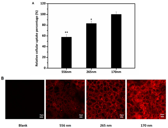 The effects of three different droplet sizes on cellular uptake of lipid-based emulsions (A) Relative uptake of emulsions of different diameters by Caco-2 cells. The 170 nanoemulsions were used as control (100% uptake). Other lipid emulsion sizes were compared to the control using ANOVA (* p < 0.05, ** p < 0.01). (B) CLSM of Caco-2 cells grown on glass coverslips after exposure to three different droplet size lipid-based emulsions containing Nile red for 4 h. Scale bar indicates 15 μm. The data were expressed as mean ± standard with three independent replicates.