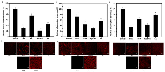 The effects of varying endocytosis inhibitors on the uptake of three lipid-based emulsions (170 nm, 265 nm, and 556 nm, respectively). (A,C,E) Relative uptake of emulsions by cells incubated with DMEM without serum and treated with three specific endocytosis inhibitors and also sodium azide (SA). The control without inhibitors was set as 100%. All data were compared to the control using ANOVA (* p < 0.05, ** p < 0.01, *** p < 0.005). (B,D,F) CLSM of Caco-2 cells grown on glass treated with inhibitors and exposure to three lipid-based emulsions for 4 h. Scale bar indicates 15 μm. The data were expressed as mean ± standard with three independent replicates.