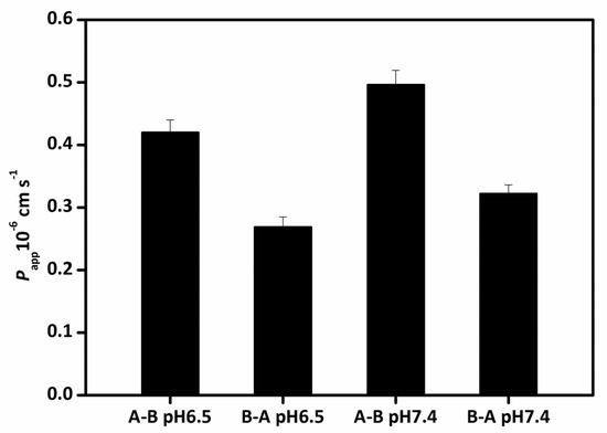 The apparent permeation rates (Papp) of lipid-based nanoemulsions were evaluated on both directions (apical (A)-basolateral (B) and B-A) at pH 6.5 and pH 7.4. The use of pH 6.5 donor media was to imitate the pH of the small intestine. For A-B transport, the Papp values of lipid-based nanoemulsions were 0.50 × 10−6 and 0.42 × 10−6 cm/s for pH 7.4 and pH 6.5 (Figure 9), respectively, suggesting that the transport of nanoemulsions through the cell is a relatively low rate process. While for B-A transport, the Papp values were 0.32 × 10−6 and 0.27 × 10−6 cm/s for pH 7.4 and pH 6.5, respectively. The results showed that the Papp values at pH 6.5 were lower than that at pH 7.4, consistent with the results in other literature [41]. The efflux ratios Papp (A-B)/Papp (B-A) were 1.54 and 1.56, respectively for pH 7.4 and pH 6.5. The (Papp) values for A-B transport were remarkably higher than B-A, indicating the transport of lipid-based nanoemulsions may be an active process and some receptor may be involved in. No appreciably TEER values changes were observed during transport, suggesting cell monolayers kept intact and the structure of tight junctions were not destroyed with nanodroplet transport. The results indicated that nanoemulsions had no cytotoxicity during transport.