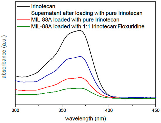 The first step was to investigate the drug loading capacity of MIL-88A. For this purpose, MIL-88A nanoparticles were loaded with irinotecan and floxuridine in different ratios through soaking in 1 mM aqueous solutions of the biotherapeutics, before coating them with liposomes. These particles were then investigated via UV/Vis spectroscopy (Figure 1) to determine the loading capacity. The absorption maximum of irinotecan at 360 nm was used as the basis for the calculations. Particles loaded with different ratios of irinotecan were examined and compared to the UV/Vis spectrum of a pure irinotecan solution to calculate the amount of drug loading. For this 1 mg of MIL-88A nanoparticles were suspended in 1 mL of a 1 mM solution of irinotecan. The amount of irinotecan in the MIL-88A nanoparticles was quantified by UV/Vis measurements, yielding a loading capacity of 21 wt % relative to the nanoparticle weight (205 µg) for loading only irinotecan, and 10.3 wt % (102 µg) of irinotecan when a 0.5 mM irinotecan and 0.5 mM floxuridine solution (further referred to as 1:1) is used for the loading. Similarly, the loading capacity of floxuridine was determined to be 3.61 wt % for a 1 mM solution of floxuridine only and in the mixtures with irinotecan it was reduced by the respective factor of dilution (measurements see Supplementary Materials). Thus, the nanoparticles can successfully be loaded with both drugs at the same time yielding a ratio of the mixture as provided in the loading solution weighted by the loading capacity of the pure drugs.