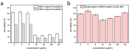(a) MTT assay of HeLa cells incubated with Lip-MIL-88A nanoparticles loaded with SBHA after three and four days of incubation. (b) MTT assay of HeLa cells incubated with the supernatant of the Lip-MIL-88A suspension after four days. The error bars represent the standard deviation.