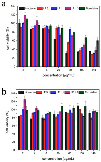 Next, the particles where loaded with both irinotecan and floxuridine in different ratios (Table 1) to determine both the effectiveness of each single drug loaded on the particles and the effectiveness of the mixtures. For this purpose, particles loaded with pure irinotecan and floxuridine and different ratios of both (1:3, 1:1 and 3:1, with the ratios referring to the molar ratios of the drugs in the loading solution) were incubated with cells. The MTT assays show that both irinotecan and floxuridine could be successfully loaded into the Lip-MIL-88A, leading to a significantly reduced cell viability of 34.6% with an IC50 of 4 µg/mL for the irinotecan-loaded version. Floxuridine had a significantly lower efficiency, which did not even reach a 50% reduction of cell viability within the measured amounts of particle administration. The mixtures of them were also tested (Table 1), with the 3:1 ratio showing the best results achieving a low cell viability similar to irinotecan alone. All tested ratios aside from pure floxuridine reduce the cell viability to 30–40% at the highest tested concentration of 140 µg/mL, while pure floxuridine only manages to reach a reduction to 60% at this particle concentration. This is in accordance to the 1:3 irinotecan:floxuridine ratio being the least effective of the investigated mixtures.