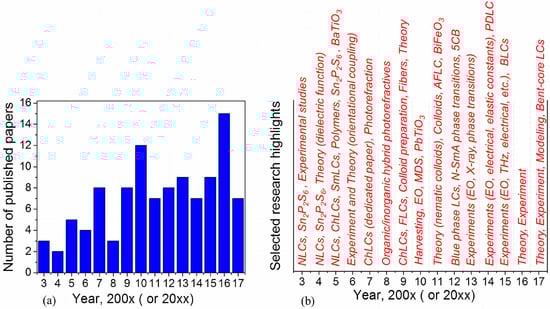 (a) Number of papers published during the 2003–2017 period; and (b) major research highlights. Nematic liquid crystals (NLCs), cholesteric liquid crystals (ChLCs), smectic liquid crystals (SmLCs), ferroelectric liquid crystals (FLCs), antiferroelectric liquid crystals (AFLC), polymer dispersed liquid crystals (PDLC), blue phase liquid crystals (BLCs), liquid crystals (LC), electro-optics (EO), molecular dynamics simulation (MDS).