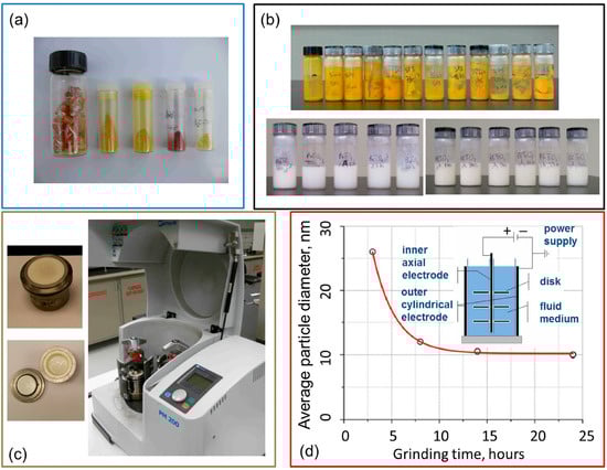 (a) Macro-crystals prior to milling; (b) The obtained dispersion of milled ferroelectric nanoparticles in a fluid carrier (heptane); (c) Commercially available high-energy ball mill; (d) an average size of the milled nanoparticles vs. grinding time []. A typical harvesting setup is shown in the inset (redrawn after []).