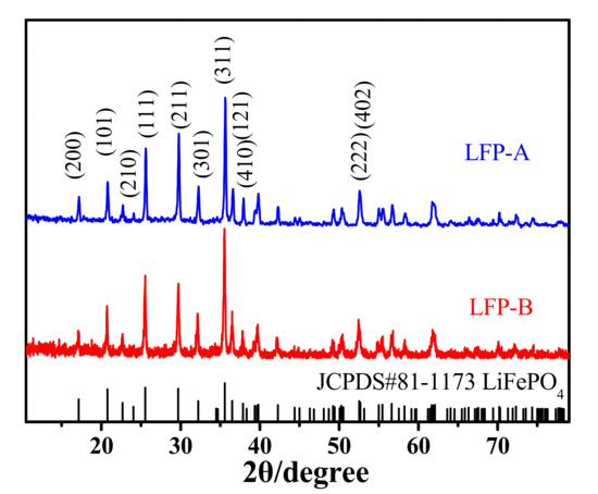The crystal structures of the two composites were investigated by X-ray diffraction. As shown in Figure 1, both samples display the orthorhombic phase with a space group Pmnb (62) (JCPDS card No. 81-1173). The profiles of the reflection peaks are quite narrow, indicating the high crystallinity of the samples. No obvious diffraction peaks of impurity phases (e.g., Fe2O3, Li3PO4, and Fe2P) are observed in the patterns, which indicate the high purity of the samples.