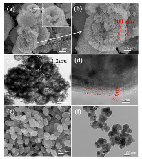 The scanning electron microscopy (SEM) images of the two samples are shown in Figure 2. Uniform spherical particles with a diameter of approximately 1~3 m are observed in Figure 2a, and the insert picture shows a broken sphere, exhibiting the likely typical hollow spherical structure of the LFP-A sample. A magnified image of an incomplete microsphere is shown in Figure 2b, indicating that the spherical particles of LFP-A sample is not solid but hollow, with an interior core similar to an egg yolk. It was also observed that the ~300 nm thick porous wall and yolk-interior of the hollow spheres are both composed of ~100 nm primary particles and the yolk is not solid, but porous. The transmission electron microscopy (TEM) micrograph shown in Figure 2c displays a general image of the hollow microspheres of LFP-A sample with a diameter of 1.2 m. The high-resolution transmission electron microscope (HRTEM) image of the primary particles shown in Figure 2d demonstrates that the nanosized particles are well-crystallized and conformably coated by about 2.5 nm of carbon layers. In contrast, the particles of the sample (LFP-B) synthesized without CTAB display a nanosized spindle-like morphology, which can be clearly observed in the SEM (Figure 2e) and TEM images (Figure 2f). Owing to the novel structure, the LFP-A sample obtains a tap density of 1.2 g cm−3, significantly higher than the 0.9 g cm−3 measured for the nanosized LFP-B sample. The tap density of the LFP-A sample is similar to the value of other microspherical LiFePO4 composites with a solid interior reported recently [34,35,36].