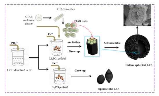 The sizes of the primary particles of LFP-A and the whole particles of LFP-B synthesized via our solvothermal route are smaller than that of the particles synthesized by the hydrothermal route in our previous work [21]. The size reduction of particles is attributed to the organic solvent EG which has two hydroxyl groups in its molecule, capable of weak linking to the LFP nanocrystallites via hydrogen bonds, thus inhibiting the growth of the crystals [15]. Comparing the micrographs of the two samples, it can be seen that the morphologies of the powders are completely changed with CTAB involved in the process. The anticipated mechanism for the formation of LiFePO4/C particles is shown in Figure 3. An EG-water mixture with a certain fraction of CTAB will self-assemble to form CTAB rod-like micelles in an ordered arrangement. With the decrease of the weight fraction of CTAB as the mixture was introduced into the Li3PO4 suspension, the growth of CTAB micelles evolves from a hexagonal crystalline phase to an isotropic solution phase [37,38]. Then, hexagonal crystalline micelles will serve as templates in the formation of Fe2+-Li3PO4 composite units which will nucleate further LiFePO4 material and the composite units grow in size to form nano-particles. As the reaction proceeds, the particle groups assemble to from spheres owing to the residual CTAB molecules, which gather particles around themselves. After calcination, hollow LiFePO4 spheres can be obtained because of the decomposition of CTAB. Therefore, the structure changes, from spindle-like solid particles to hollow microspheres, can be attributed to the presence of the CTAB surfactant. The CTAB in the solvothermal synthesis also works as a carbon source, and is converted to conductive amorphous carbon after heat treatment. Meanwhile, it acts as a carbonaceous-reducing agent during heating to prevent oxidation of Fe2+ to Fe3+.
